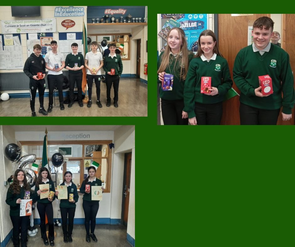 There are lots of activities in school during this week for example poster competitions and quizzes. There are wonderful prizes for the winners. Music Sessions and Sean-nós dancing is organised for the students. Songs are sang through Irish in classes. Everyone has great fun during this week. The students and the teachers all make a big effort to speak Irish as often as they can.